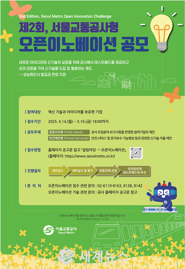 [세계뉴스 = 차성민 기자] 서울교통공사가 도시철도의 미래를 준비하기 위해 다양한 혁신 아이디어를 찾고자 '제2회 서울교통공사형 오픈이노베이션 공모'를 개최한다.