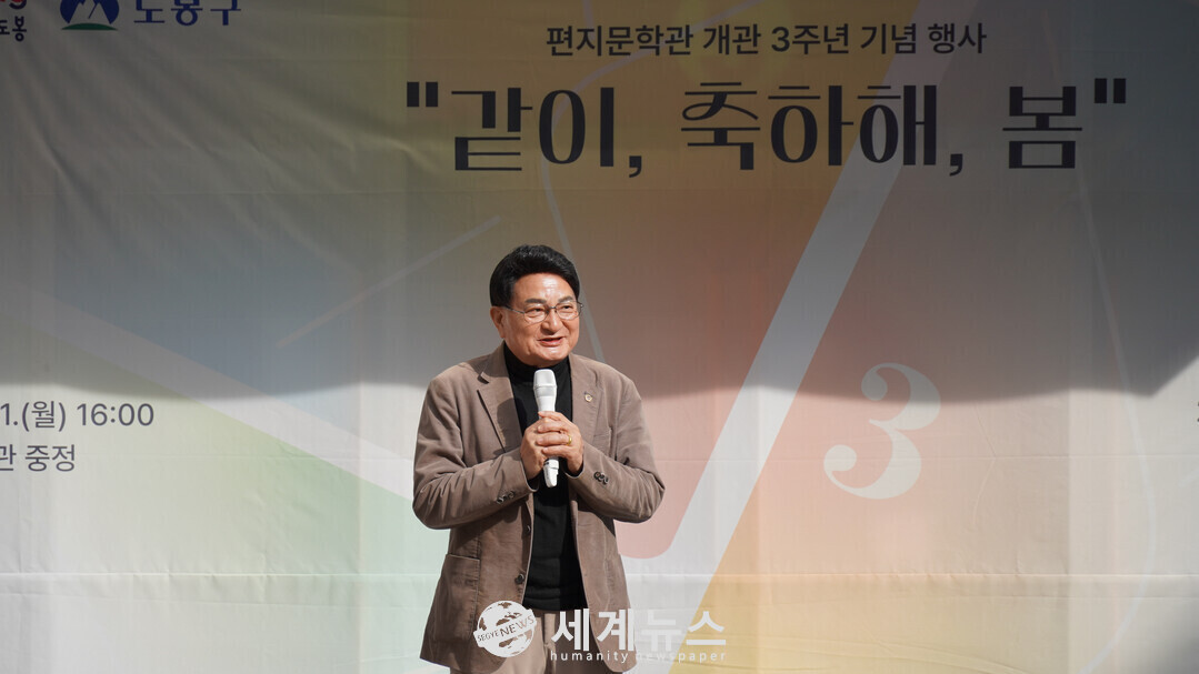 [세계뉴스 = 윤소라 기자] 서울특별시의회 홍국표 의원(국민의힘·도봉2)이 지난 3월 31일 도봉구민회관 중정에서 열린 편지문학관 개관 3주년 기념행사 "같이, 축하해, 봄"에 참석해 축하의 메시지를 전했다.