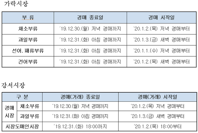 가락시장 수산시장 중 선어, 패류부류는 ’19.12.31. 아침 경매를 끝으로 휴장했다가 ’20.1.1. 저녁 경매부터 다시 시작될 예정이며, 건어부류는 ’19.12.31. 아침까지 경매가 열리고 ’20.1.2. 새벽 경매부터 재개된다.
