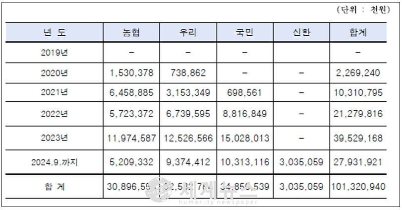 은행별로는 국민은행이 348억 원, 우리은행이 325억 원, 농협은행이 309억 원, 신한은행이 30억 원을 지원받았으며, 이자 부담은 매년 눈덩이처럼 불어나고 있다.