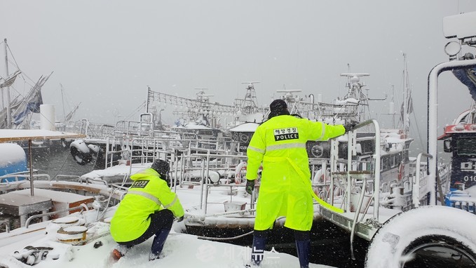 비응항 7일 오후 2시 현재 15cm의 폭설이 내리고 엎친데 덮친격으로 찬바람이 강하게 불면서 기온까지 뚝 떨어져 추위가 기승을 부린 가운데도 비응파출소는 적설취약구조물, 부두 턱 걸림 선박 및 폭설 무게 눌린 선박침수방지, 해상 안전시설 파손 우려여부 등에 대한 순찰활동으로 사고예방에 힘을 쏟고 있다.