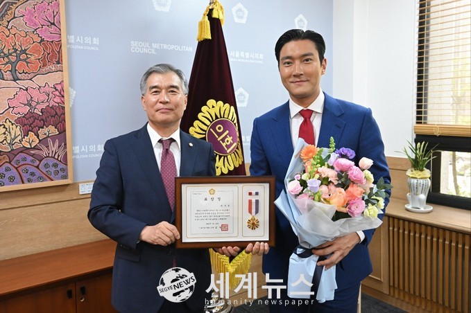 [세계뉴스 윤소라 기자] 김현기 서울특별시의회 의장은 12일 슈퍼주니어 멤버이자 배우 최시원에게 의장 표창을 수여했다.