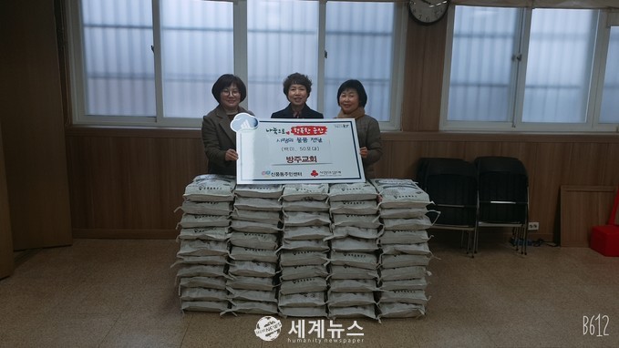군산시 신풍동은 지난 26일 방주교회(담임목사 장미선)가 연말연시를 맞아 관내 어려운 이웃에게 전달해 달라며, 이웃돕기 성품(백미 10kg, 50포대)을 기탁했다고 밝혔다.