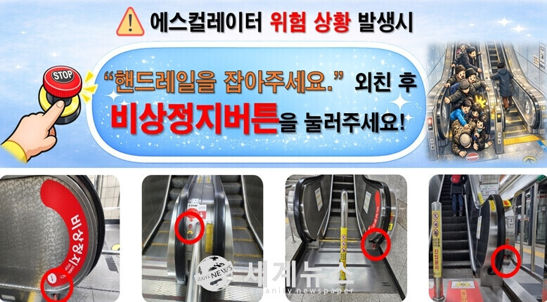 [세계뉴스 = 차성민 기자] 지하철 에스컬레이터에서 넘어지거나 신발·옷이 끼는 사고가 발생했을 때 피해를 최소화하는 가장 빠른 방법은 비상정지버튼을 즉시 누르는 것이다. 에스컬레이터 특성상 한 사람이 넘어지면 뒤따르던 승객들이 연쇄적으로 넘어질 수 있어, 사고 직후 초기 대응이 무엇보다 중요하다.