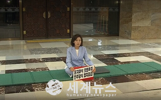 [세계뉴스 = 전승원 기자] 30일 나경원 국민의힘 의원이 국회 로텐더홀에서 농성을 이어갔다. 나 의원은 김 후보자의 지명 철회와 법제사법위원장직 반환을 촉구하며 나흘째 국회 로텐더홀에서 농성 중이다.