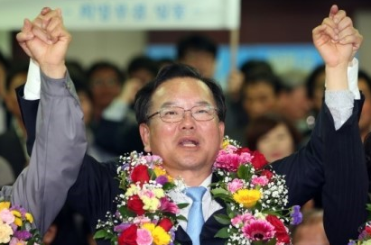 ▲ 13일밤 더민주 김부겸 후보가 당선을 확정짓고 만세를 부르고 있다. © 세계뉴스 |