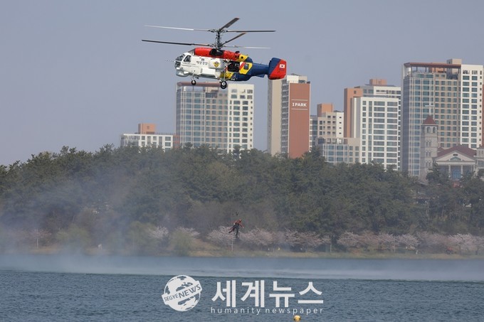 ▲헬기를 이용한 익수자 구조훈련 시연 모습 |