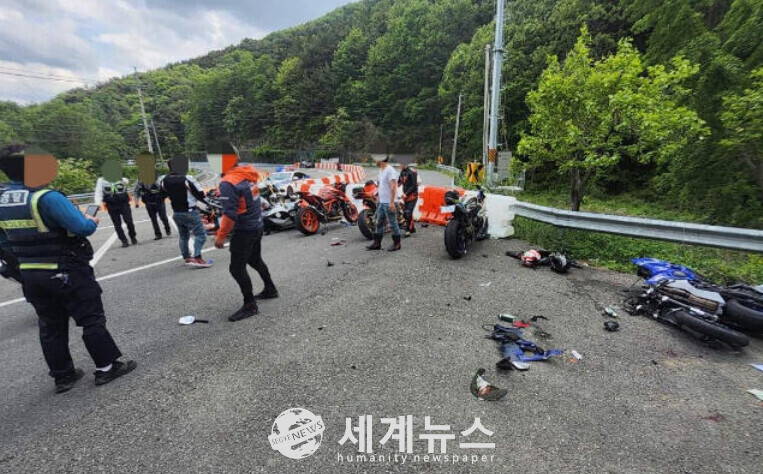 지난 11일 오후 1시 41분쯤 경북 청도군 운문면 서지리 20번 국도에서 일어났다. 사고를 낸 오토바이는 중앙선을 넘어 반대편 갓길에 정차해 있던 오토바이들을 차례로 들이받았다.