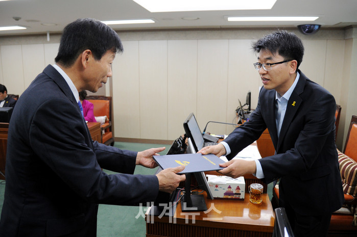 ▲ 29일 인사검증에 앞서 신임 박현출 사장(왼쪽)이 낭독했던 '선서문'을 김용석 기획경제위장(오른쪽)에게 제출하고 있다. © 세계뉴스 |