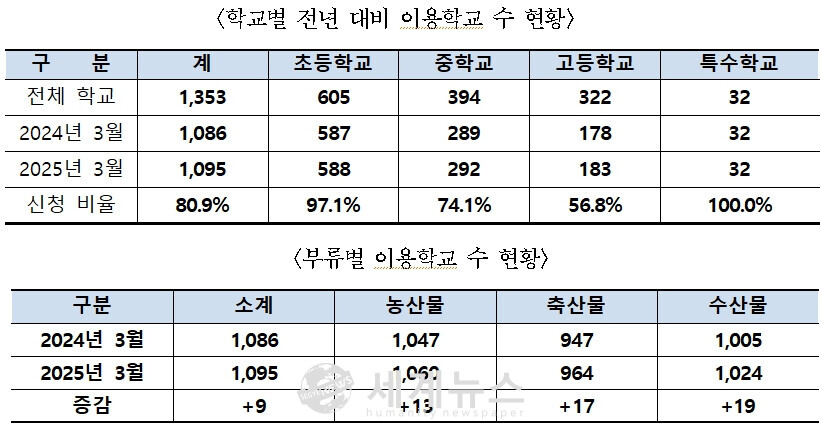올해 1월 20일부터 시작된 신청 접수 결과, 1,095개 학교가 센터를 통해 식재료를 공급받겠다고 신청했다. 이는 서울시 학교급식 실시학교의 81%에 해당하며, 전년 대비 9개교가 증가한 수치다.