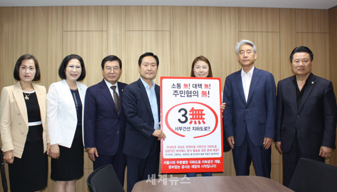 ▲ 서울시의회 김춘수 의원(왼쪽 3번째)은 21일 서울시가 서부간선도로 지하화 공사를 추진하면서 주민과의 소통을 지적하며 주민들과 충분히 소통을 주문했다. © 세계뉴스 |