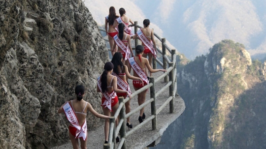 이런 아찔한 고난도 트래킹 코스에 미녀들이 나타났다. 모두 아찔한 빨간색 비키니 차림에 아슬아슬한 블랙 킬힐을 신고 있다. 국제 비키니 미인 선발대회 중국 화중지역 결선에 오른 10명의 미녀들은 긴장감, 아니 공포감을 이겨내려는 듯 하나같이 이를 악물고 있다.