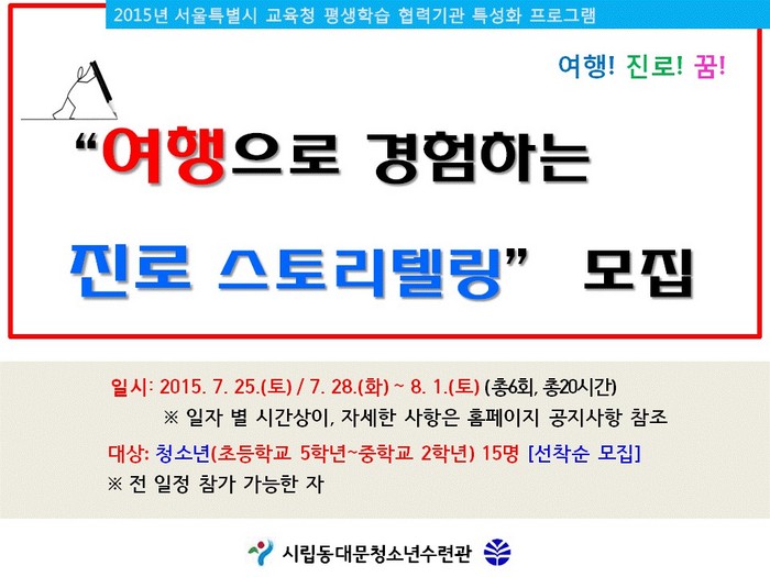 이번 여름방학 여행으로 경험하는 진로스토리텔링은 시립동대문청소년수련관에서 총6일간 진행하며 7월 25일부터 8월 1일(7월 27일 제외)까지다. 교육시간은 토요일은 오전부터이며, 평일은 오후1시부터 진행한다.