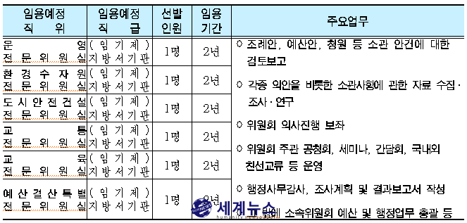 이번 신규채용 대상은 총 6개로, 운영·환경수자원·도시안전건설·교통·교육·예결특위전문위원실 수석전문위원 직위이며, 2월 28일부터 3월 7일까지 원서접수, 이후 3월중 서류전형 및 면접시험을 실시한 후 4월 중에 최종합격자를 발표할 예정이다.