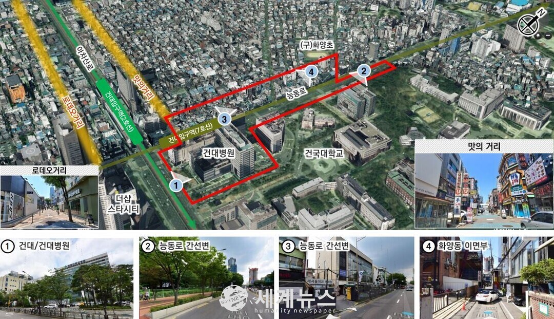 화양2지구는 건대입구역 주변으로, 지하철 2호선과 7호선이 지나는 더블 역세권에 위치해 있다. 이곳은 건국대학교와 대학병원, 다양한 상권이 밀집해 있어 하루 약 24만 명의 유동인구가 몰리는 동북권 최대의 상업 지역이다.