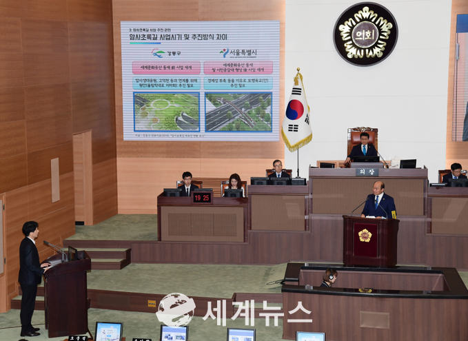▲ 황인구 서울시의원이 제287회 정례회 제3차 본회의에서 암사초록길 사업 추진과 관련해 정수용 한강사업본부장에게 질의하고 있다. |