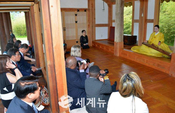 ▲ 미국 워싱턴주 스노호미시 카운티 린우드시 니콜라 스미스 시장과 관계자 일행이 담양대나무 축제장을 찾아 가야금 연주를 관람하고 있다. |