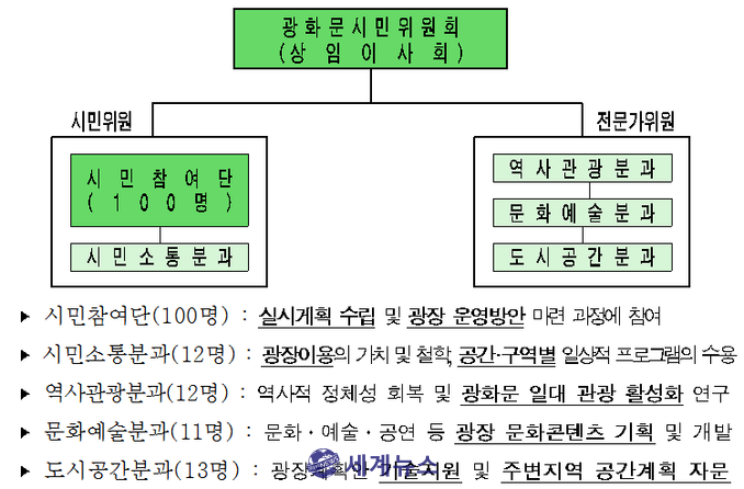 위원회 조직은 ▴100인의 ‘시민참여단’ ▴50인의 전문가 그룹이 참여하는 4개 ‘분과위원회’(시민소통‧역사관광‧문화예술‧도시공간) ▴위원회의 주요 의사결정을 하는 ‘상임이사회’로 구성된다.