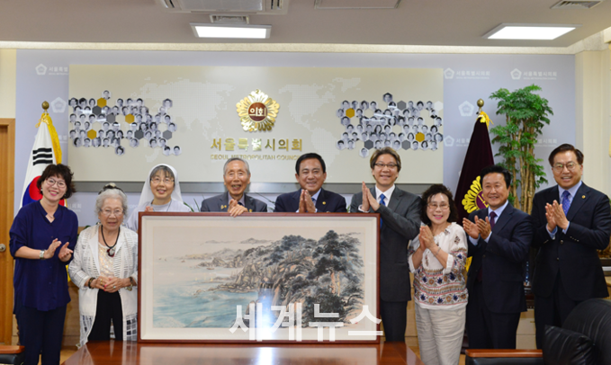 [세계뉴스] 전승원 기자 = 지난 19일 오후 여류 화가 수향 이순영 작가(83세)가 서울시의회 초대 회고전을 마치고 애장품인 ‘동해’를 서울시의회에 기증했다.