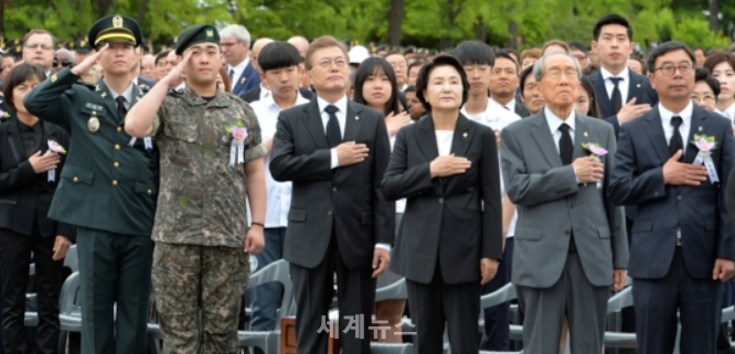 ▲ 문재인 대통령이 6일 서울 국립서울현충원에서 거행된 제62회 현충일 추념식에 참석해 국민의례를 하고 있다. 문 대통령 옆에는 2년 전 북한의 비무장지대 지뢰도발 당시 부상을 입은 김정원(왼쪽 첫번째), 하재헌(왼쪽 두번째) 중사가 자리하고 있다. © 세계뉴스 |