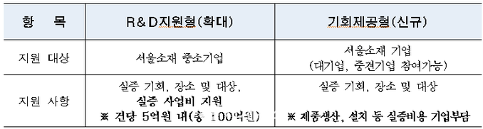 적용 대상은 서울 소재 중소‧벤처기업의 상용화 직전 제품 또는 서비스이다. 서울시 본청과 서울교통공사, 서울시설공단 등 투자출연기관, 사업소의 각종 시설물과 현장에서 최대 1년 간 적용하고 테스트 할 수 있고, 실증사업비로 최대 5억 원까지 지원한다.