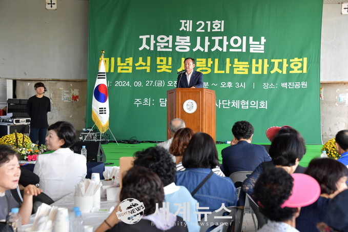[세계뉴스 양경희 기자] 담양군 자원봉사협의회 주관으로 27일 백진공원 일원에서 열린 ‘제21회 자원봉사자의 날 기념식 및 사랑나눔 바자회’가 1,000여 명의 자원봉사자와 지역주민들이 참여한 가운데 성황리에 마무리됐다.