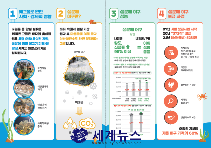 또한, 어업현장에 홍보물을 배포하여 생분해 그물의 필요성과 우수성에 대한 홍보를 강화할 예정이다. 홍보물에는 폐그물의 사회.경제적 영향, 생분해 그물의 성능, 효과, 구매 방법, 사용 보관방법 등 내용이 담길 예정이다.