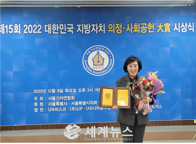 [세계뉴스 윤소라 기자] 서울특별시의회 기획경제위원회 신복자 의원(국민의힘, 동대문4)은 8일 서울특별시의회 제2대회의실에서 개최된 ‘제15회 2022 대한민국 지방자치 의정대상’을 수상했다.