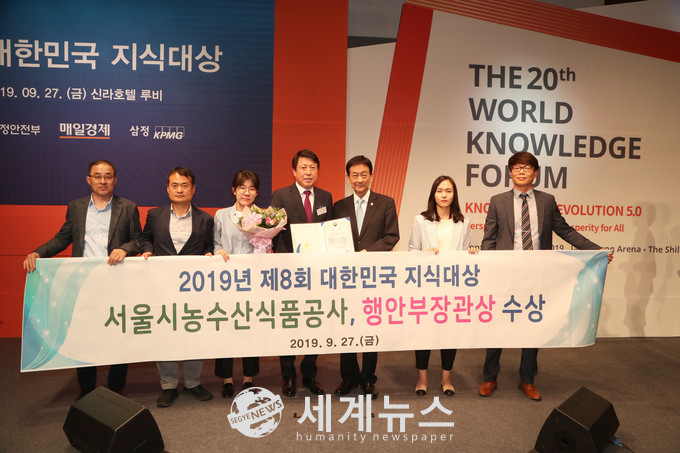[세계뉴스 조홍식 기자] 서울시농수산식품공사(사장 김경호)는 지난 27일 서울 신라호텔에서 열린 2019년 ‘제8회 대한민국 지식대상’에서 행안부장관상을 수상하는 영예를 안았다.