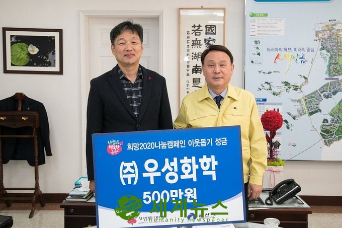 군산시는 서수 동군산산업단지에 위치한 ㈜우성화학(대표 석상신)이 지난 10일 코로나 바이러스에 상대적으로 취약한 저소득층을 위해 세정제 구입 등에 써달라며 오백만원의 성금을 기탁했다고 밝혔다.