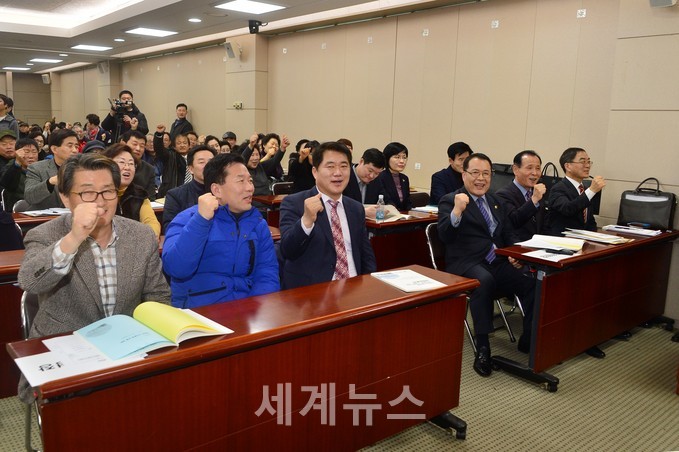 ▲ '신림선 경전철 고시촌역 신설을 위한 정책토론회'에 앞서 토론자와 지역 주민들이 한마음으로 화이팅을 외치고 있다. © 세계뉴스 |