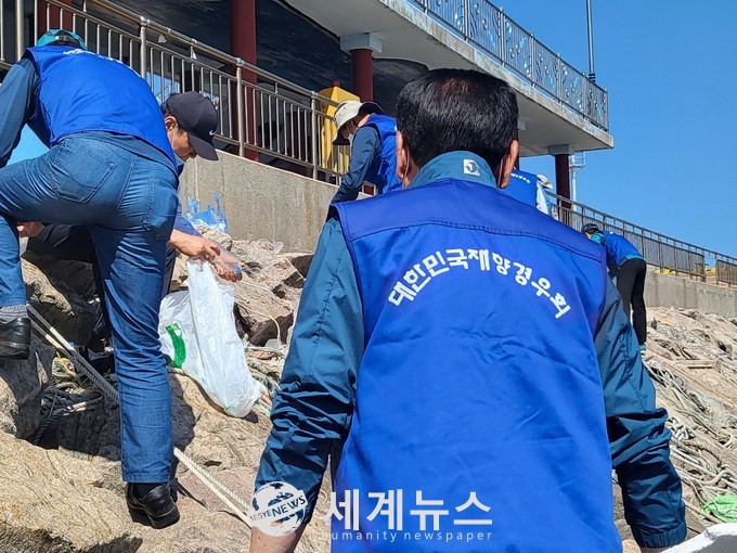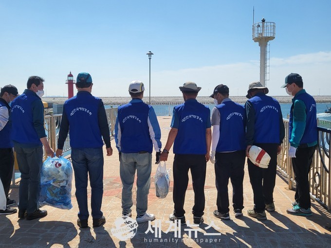▲ 전북해양경찰경우회원들이 비응항에서 쓰레기를 수거하고 있는 모습(사진 = 윤준필기자) |