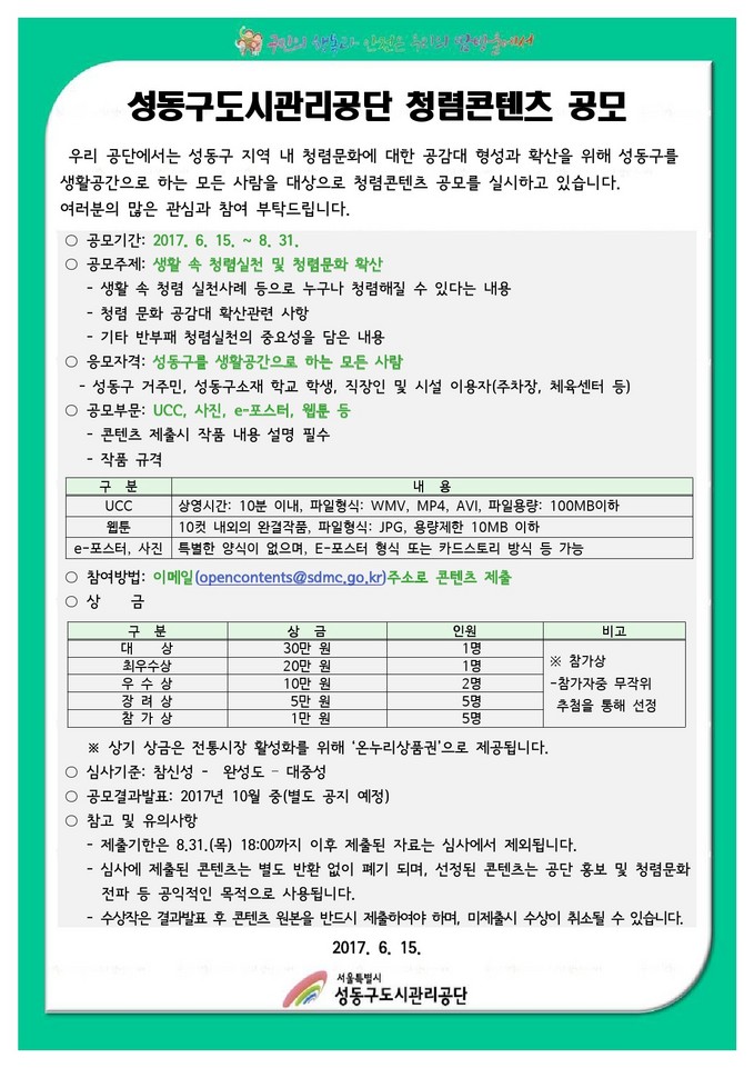 공모분야는 UCC, 사진, e-포스터, 웹툰 등이며, 주제는 ‘생활 속 청렴실천 및 청렴문화 확산’이다. 성동구민, 성동구 소재 학교에 재학중인 학생, 직장인 및 공단 시설 이용자 등 성동구를 생활공간으로 한다면 누구나 참여할 수 있다.