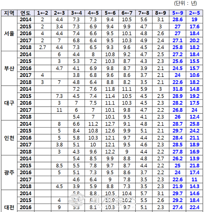 ▲ 2014~2018 광역자치단체 직급별 평균승진 소요 연수. |