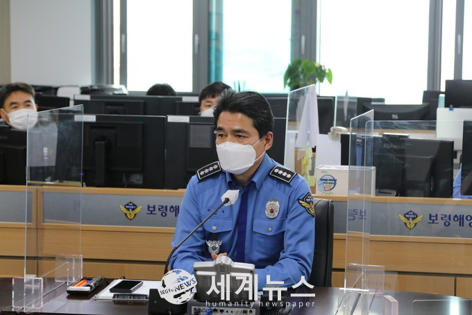 ▲ 상황실에서 업무현황을 보고 받고 있는 하태영 보령해양경찰서장. |