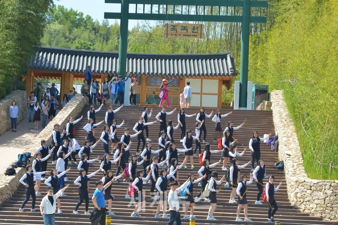 ▲ 죽녹원 앞에서 죽취아리랑 플레스몹을 펼치고 있는 학생들과 군민들 © 세계뉴스 |