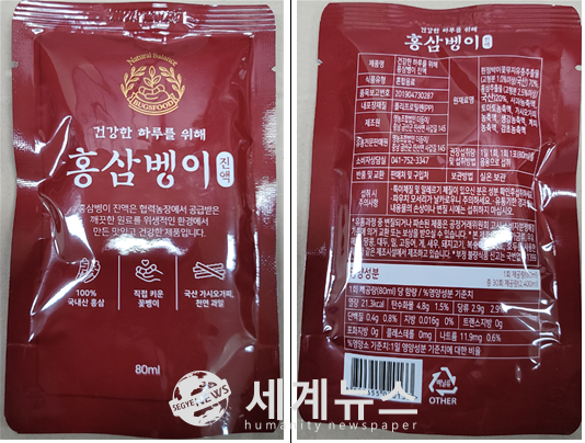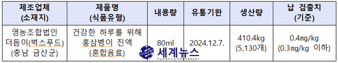 [세계뉴스 정서영 기자] 식품의약품안전처(처장 오유경)는 식품제조‧가공업체인 ‘영농조합법인 더듬이(벅스푸드)(충남 금산군 소재)’가 제조‧판매한 ‘건강한 하루를 위해 홍삼벵이 진액(식품유형: 혼합음료)’에서 납이 기준치(0.3㎎/㎏ 이하)보다 초과 검출(0.4㎎/㎏)되어 해당 제품을 판매 중단하고 회수 조치했다.