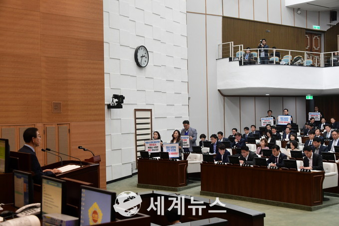[세계뉴스] 전승원 기자 = 제10대 서울시의회의 제284회 정례회 첫날인 1일 오후 2시 30분경 자유한국당 소속 6명이 일제히 서울교통공사의 채용비리 의혹을 규탄했다.