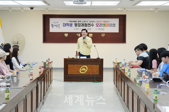 ▲ 3일 동대문구청 기획상황실에서 열린 ‘2017년 여름방학 대학생 행정체험연수 오리엔테이션’에서 유덕열 동대문구청장이 인사말을 하고 있다. © 세계뉴스 |