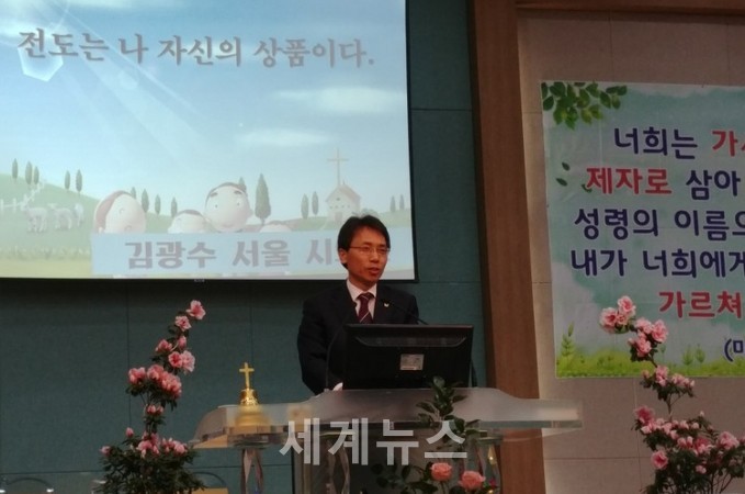 ▲ 김광수 서울시의원은 상명교회의 간증집회에 초대받아 '전도는 나 자신의 상품이다' 주제로 특강했다. © 세계뉴스 |