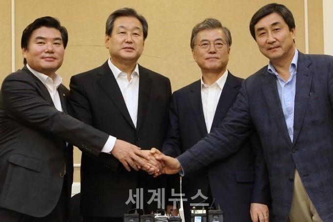 ▲ 새누리당 김무성 대표(왼쪽 2번째), 원유철 원내대표(왼쪽), 새정치민주연합 문재인 대표(오른쪽 2번째), 이종걸 원내대표(오른쪽). © 세계뉴스 |