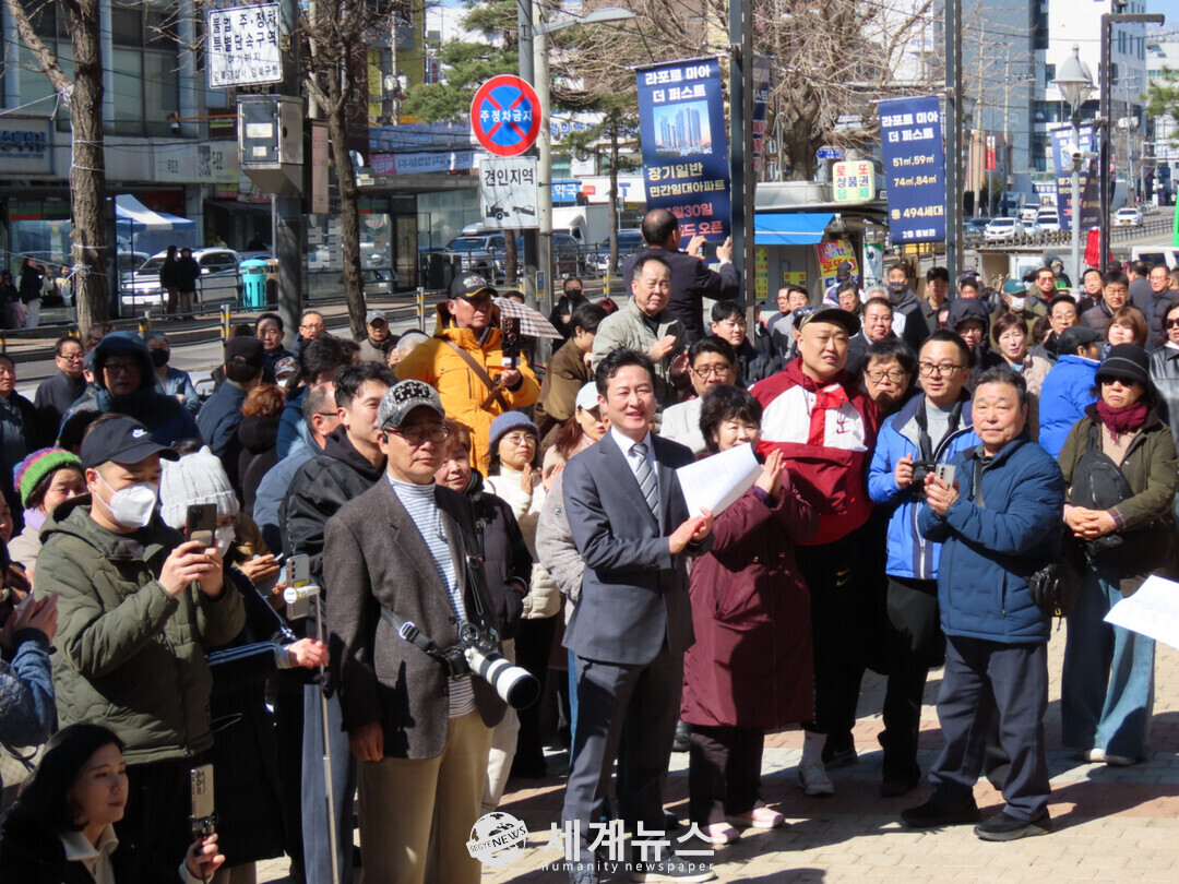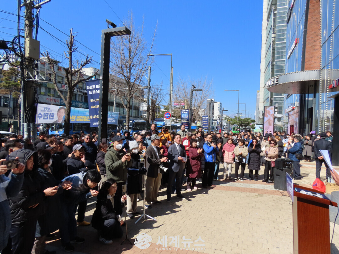 7일 오후 1시 30분 서울 미아사거리역 1번 출구 앞에서 열린 출마 기자회견에는 추운 날씨에도 불구하고 주민 약 300여 명이 모여 이 예비후보자의 출마 선언을 지켜봤다.