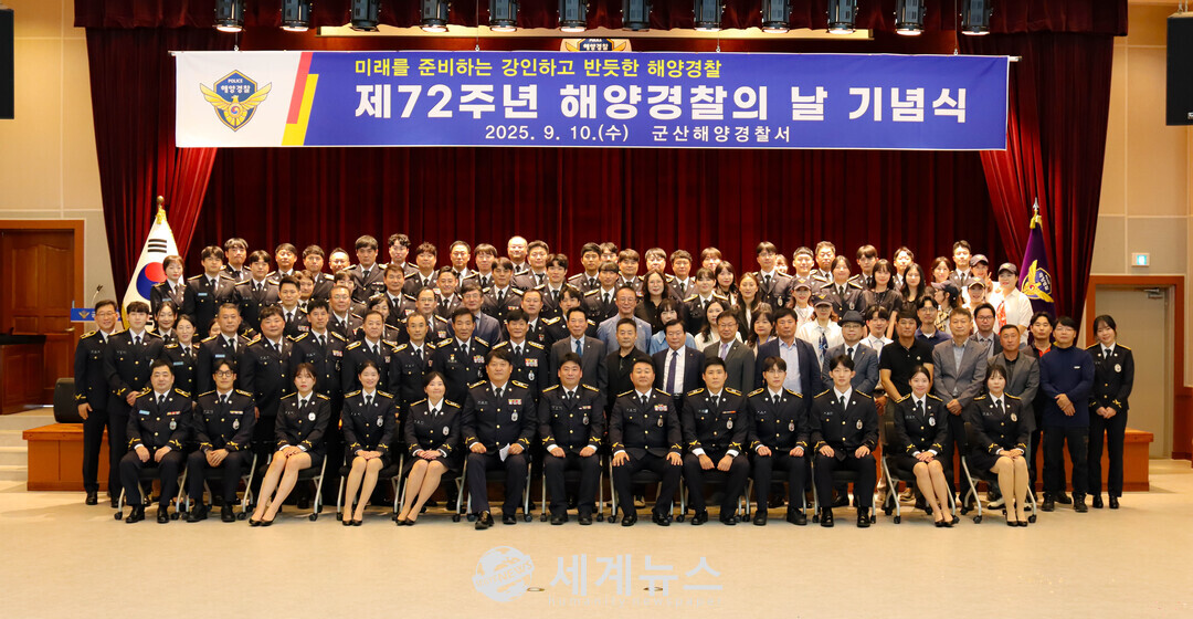 [세계뉴스 = 윤준필 기자] 군산해양경찰서는 해양경찰 창설 72주년을 맞아 제72회 해양경찰의 날 기념식을 성대히 개최했다. 이 기념식은 군산시 금동에 위치한 군산해경 청사 대강당에서 열렸으며, 현장 근무자를 제외한 해양경찰관, 경우회, 정책자문위원회, 해양구조협회 등 내·외부 관계자 100여 명이 참석했다.