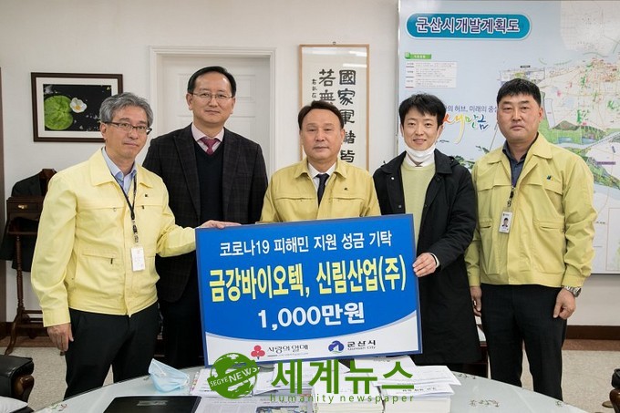 태양광관련 조명 기기 및 전구 등 조명장치를 제조하는 ㈜해라이트(대표이사 이옥재)와 친환경 비료, 토양개량제 등 비료 및 질소화합물을 제조하는 금강바이오텍(대표이사 강금례), 신림산업㈜(대표이사 방승준)에서도 어려운 이웃을 위한 성금을 군산시에 기탁하였다.