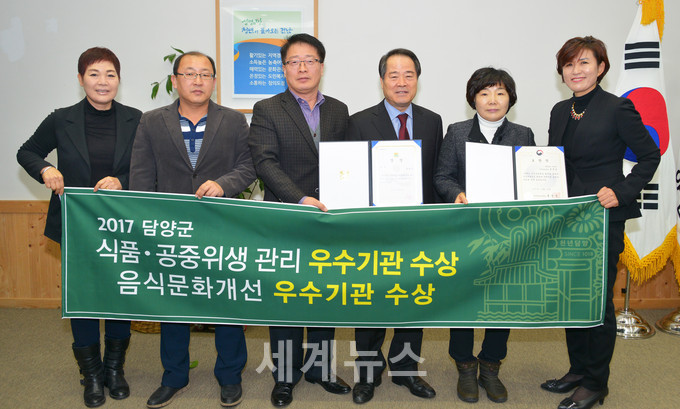 ▲ 최형식 담양군수(오른쪽 3번째)는 26일 식품의약품안전처에서 주관한 음식문화개선사업 평가에서 ‘우수기관’으로 선정돼 기관 표창을 수상했다. © 세계뉴스 |