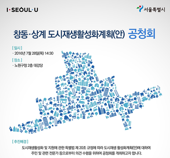 공청회는 ▴창동·상계 경제기반형 도시재생활성화계획(안) 발표 ▴전문가 토론 및 방청석 질의답변 순으로 진행되며 전문가토론은 조명래 단국대 교수를 좌장으로 박태원 광운대 교수, 신중경 세종대 교수, 양재섭 서울연구원 도시공간연구실장을 비롯해 구자훈 창동·상계 총괄코디네이터, 최정한 도시재생협력지원센터장, 정거택 동북권사업반장이 참석한다.