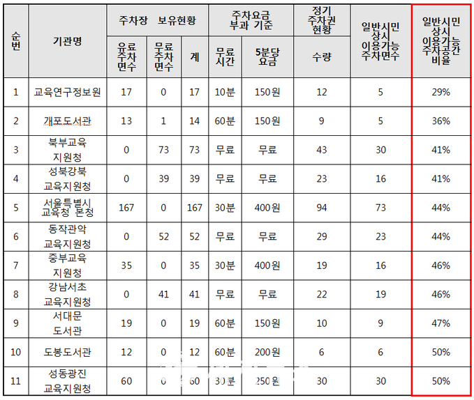 그러나 올해 3월 기준 교육청 본청 및 직속기관 중 일반이용자들이 상시 사용할 수 있는 주차공간을 전체 주차면수 대비 과반 이상 확보해둔 곳은 총 29곳(72.5%)에 불과했던 것으로 나타났다. 나머지 11곳의 기관들은 일반 이용자가 자유롭게 이용 가능한 주차면수 확보율이 50%에 미치지 못했으며, 이 중 2곳은 조례에서 규정하고 있는 40%의 확보율도 충족하지 못한 것으로 조사됐다.