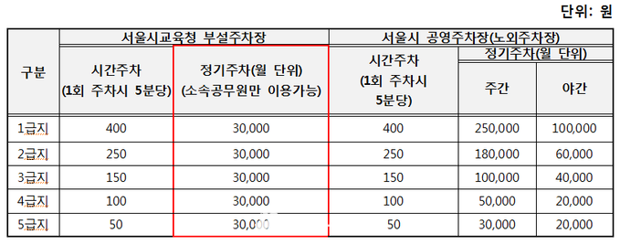 교육청 ‘월 정기주차 사용료 3만원 ↔ 서울시 17만 5천원’... 직원만 이용 가능