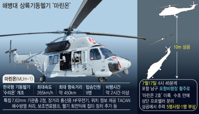 또한 “해병대 마린온의 원형인 수리온 헬기가 2012년 말 전력화된 이후 여러 유형의 사고와 결함이 있었지만, 이번처럼 주회전날개가 통째로 떨어져 나간 사례는 없었다”며 “기본설계 결함이나 기체 및 장비결함 등을 집중적으로 규명할 계획”이라고 밝혔다.