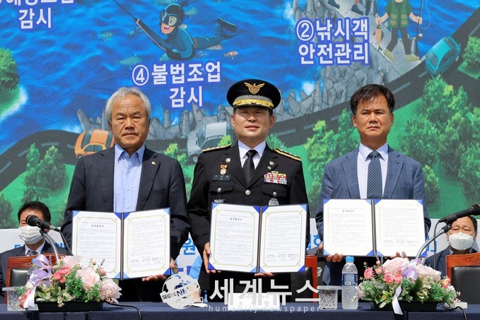 ▲ 4일 군산해양경찰서 드론 순찰대 발대식 행사에서 김상겸(왼쪽) 한국구조협회 북부지부 협회장과 조성철(가운데) 군산해양경찰서장, 노형만(오른쪽) 전북인력개발원장이 협약식을 가졌다. |